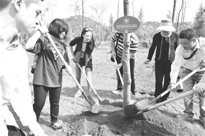 8月13日,中国国民党中央委员、财团法人青年发展基金会董事长连胜文,率台湾20余位青年代表赴云南进行体验式交流,参观石林台湾农民创业园、云大启迪K栈众创空间,和在滇台商代表、云南创业青年进行交流。图为两岸青年代表在云南大学种下纪念树。 刘冉阳 摄影报道