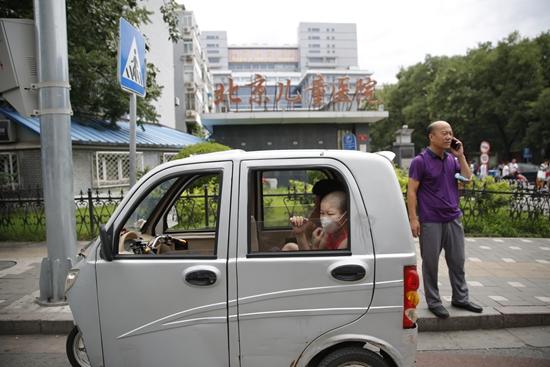 北京儿童医院西门外,马延武在接听电话。车怡岑/摄