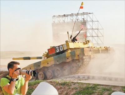 年轻的中国坦克手憋足了劲。号令一发,中国队一马当先。但出师不利,第一车组火炮侧射时,由于尘土飞扬,严重影响目标,出现失误。