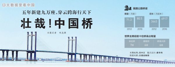 堤坝高筑,突破难题。2016年竣工的三峡升船机,是世界上规模最大、技术难度最高的升船机。2016年12月29日通车的贵州北盘江大桥,最高落差565米,成为世界第一高桥。今年7月7日,全球最长的跨海大桥——港珠澳大桥主体工程全线贯通。作为史上里程最长、施工难度最大的跨海桥梁,它首创桥—岛—隧集群方案,开辟了世界上最长的沉管海底隧道,被誉为“当代世界七大奇迹之一”。