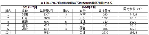 从地区来看,7月微信举报量排名前5的省份分别为河南、广东、福建、山东和河北,其中河南省微信举报量比去年同期增长7倍。