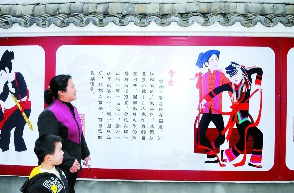 一幅风格清新大气的统战文化墙,让居民们眼前一亮,路过的旅客也纷纷驻足观看。桃源村村民李茹一边欣赏着墙体画,一边说:“今天才发现这里的墙面画换了新内容,我是湖南侗族远嫁到这儿来的,你看这幅画正是我们侗族的特有服饰,不仅颜色靓丽,内容真实,仿佛又回到我的侗族家乡一样,每次走到这里都忍不住停下脚步看一会儿?!?/p>