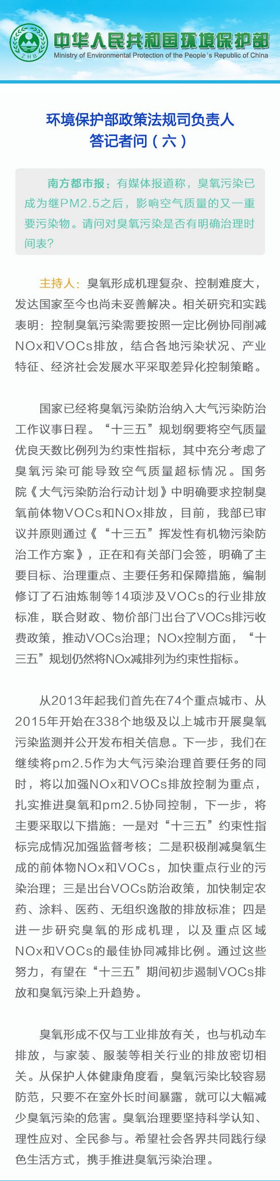 环保部政策法规司司长别涛明确,环保部在继续将pm2.5作为大气污染治理首要任务的同时,将以加强NOx和VOCs排放控制为重点,扎实推进臭氧和pm2.5协同控制。