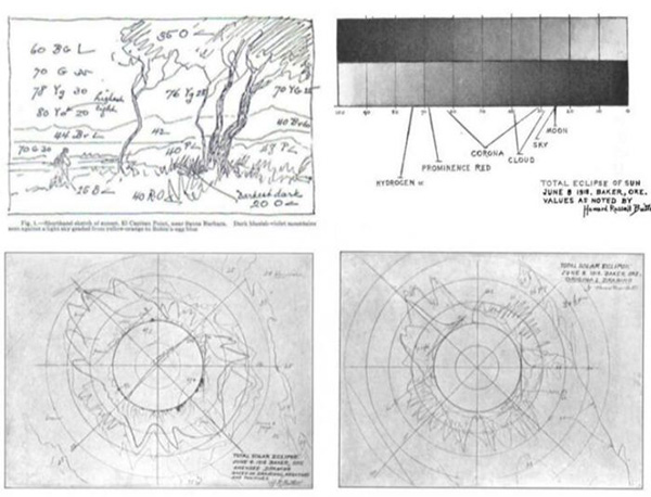 巴特勒1918年画的日食中,光洁的橙色日冕将漆黑的太阳团团裹住,天空点缀着黑灰色的云,让人想起弗雷德里克·艾德温·丘奇(Frederic Edwin Church)、阿尔伯特·比尔施塔特(Albert Bierstadt)和其他美国景物艺术家的作品。这幅画是日食三联画的其中一幅。另两幅分别是:1923年在加利福尼亚观测所作,包括黑太阳边缘一片金黄色的闪光,即所谓的倍里珠(Baily’s beads,日全食时所见的犹如一串亮珠的弧形亮斑,太阳即将被全部遮挡时出现);以及1925年康涅狄格州的日食,其中有长长的白色光穿透云层。这些便是日冕层产生的太阳风,不过有艺术情调的观测者可能会联想到文艺复兴时期绘画中的光环。