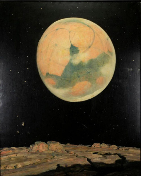 在可以用相机全面捕捉到日食之前,巴特勒的画获誉极高,因为它们不仅是个人观察成果,还是重要的学术研究材料。1920年代中期,他还在做美国自然历史博物馆的顾问,并设计了一只巨大的航天翼,可惜由于大萧条的到来未能实现。这一时期,巴特勒画了许多天体图景:从凹凸不平的月球表面看蓝色的地球,或者从火星的卫星上看朱红的火星。想象超越了观察,比如火卫二的表面呈现为烧红的黏土状,但这些也是基于大气、阴影和光的折射的模型和精确计算。但是他也放纵了自己一次,在《从火卫一看火星》底部,红色星球的阴影中,是一个人的头部轮廓。据推测应为画家本人,在这片没有空气的星球上孤独作画。