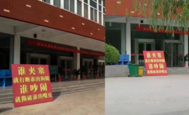 近日有家长和学生反映河南省长垣县第一中学的食堂门口出现不文明的标语牌,上面写有“谁加塞就打断谁的狗腿,谁吵闹就撕烂谁的嘴皮?!币⑸缁峁刈?。