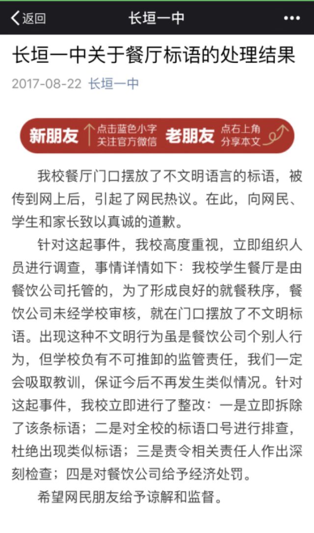 另外校方还给出四项整改内容,包括一是立即拆除了该条标语;二是对全校的标语口号进行排查,杜绝出现类似标语;三是责令相关责任人作出深刻检查;四是对餐饮公司给予经济处罚。(记者 谢青)