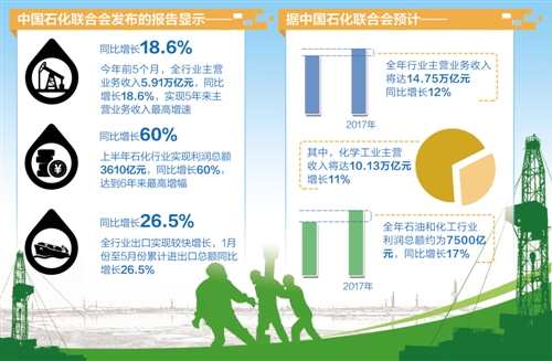 中国石化联合会发布的报告显示,今年前5个月,全行业主营业务收入5.91万亿元,同比增长18.6%,实现5年来主营业务收入最高增速。同时,上半年石化行业实现利润总额3610亿元,同比增长60%,达到6年来最高增幅。此外,全行业出口实现较快增长,1月份至5月份累计进出口总额同比增长26.5%。