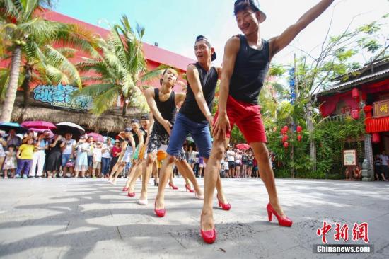 三亚千古情景区举办“百名男士高跟鞋大作战”活动。中新社记者 钟欣 摄