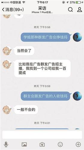 她称,为了让这些广告群有更多的人进来,每年高考结束后到9月份开学前这段时间,他们会把群名称改成“新生群”,“比如今年就改成‘(某某高校)2017级新生群’,这样,进来的新生以为是学校的群,对我们会比较信任。如果发广告后,有新生做了兼职什么的,我们可以拿提成,有的单子一个人能提100元”。