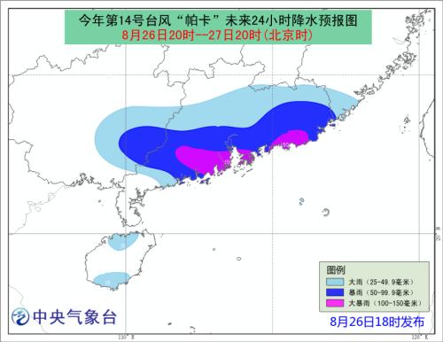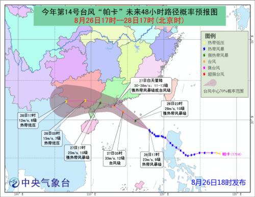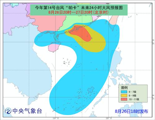 中新网8月26日电 中央气象台8月26日18时发布台风橙色预警:预计今年第14号台风“帕卡”将于27日白天在广东深圳到阳江一带沿海登陆。