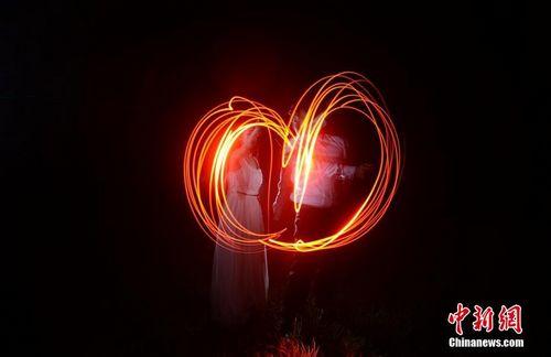 情侣湖南湄江拍创意光绘照迎“七夕”,情侣用手电筒画出了心形的图案。杨华峰 摄