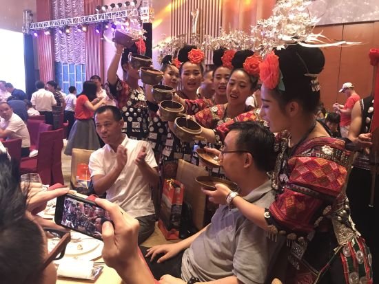 为缓和现场气氛,西江公司的演员们还上演了《敬酒歌》、《掌坳铜鼓舞》、《木叶声声》、《锦鸡舞》等独具苗族特色的歌舞赢得现场嘉宾的阵阵掌声,特别是歌舞《高山流水》让现场与会人员感受到了苗族同胞最隆重的待客礼仪。