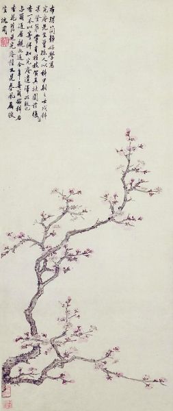画上瘦杏一株,花开烂漫,仍是折枝简笔,却多添了颜色。树干以赭色填充,花片则淡粉轻红,温润又悦目,几乎可以想象他挥毫时愉快的心情。也有题跋,也有诗: