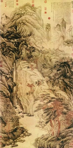 在沈周的名作中,现藏台北故宫博物院的《庐山高》很受瞩目。它绘制于成化三年(1467),其时沈氏正四十岁,还是壮年,风格亦以精细为主。这是一幅贺寿之作,送给他的老师陈宽。全轴精力弥满,以几乎全部画面描摹庐山高峻之状。对远山只作简单交代,借着一片云气画出它的连绵邈远。中景山体坚实有力,处处峰峦飞动,盘旋扭曲,又都向上仰起,好似各自都有生命,这是对元代王蒙画风的继承与发扬。当视线顺着左上端垂下的飞瀑来到画面右下角,可见全轴中仅有的几株大松树下,站着一位抬头仰望的士人。于是,这幅画虽非后来那种可居可游的文人小景,却因其不曾脱离现实景象,依然能让人感到可信。