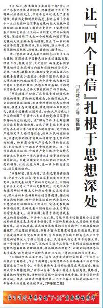 8月17日,陈昌智在《团结报》上发表学习习近平总书记“7?26”重要讲话精神的署名文章《让“四个自信”扎根于思想深处》。