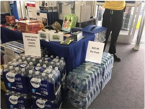 根据新闻记者肯?克利彭施泰因(Ken Klippenstein)推特曝光的照片,百思买一捆瓶装水(24瓶)价格高达42美元(约合人民币277元),12瓶一捆的瓶装水价格也高达29美元(约合人民币191元)??显谕铺厣纤档溃骸靶菟苟僖痪用窀曳⒗凑庹耪掌?,29美元的瓶装水旁还写着限量供应?!?/p>