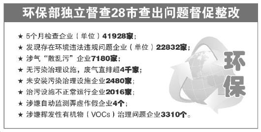 4月7日至8月31日,环保部派出的大气污染防治28个强化督查组已完成10轮次督查?;繁2客嘎叮胧奈侍馄笠抵?,涉气“散乱污”问题企业7180家,超标排放的67个,未安装污染治理设施的2480个,治污设施不正常运行的2016个,涉嫌自动监测弄虚作假的4个,挥发性有机物(VOCs)治理问题的3310个。