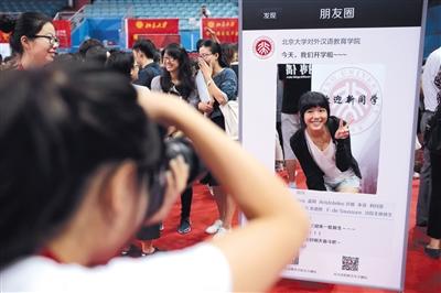 9月2日,北京大学邱德拔体育馆,来此报到的2017级新生在个性定制的相框内留影。新京报记者 朱骏 摄