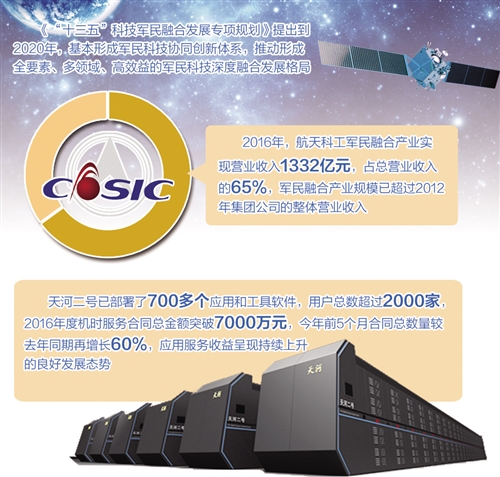 数据显示,2016年,航天科工军民融合产业实现营业收入1332亿元,占总营业收入的65%,军民融合产业规模已超过2012年集团公司的整体营业收入。