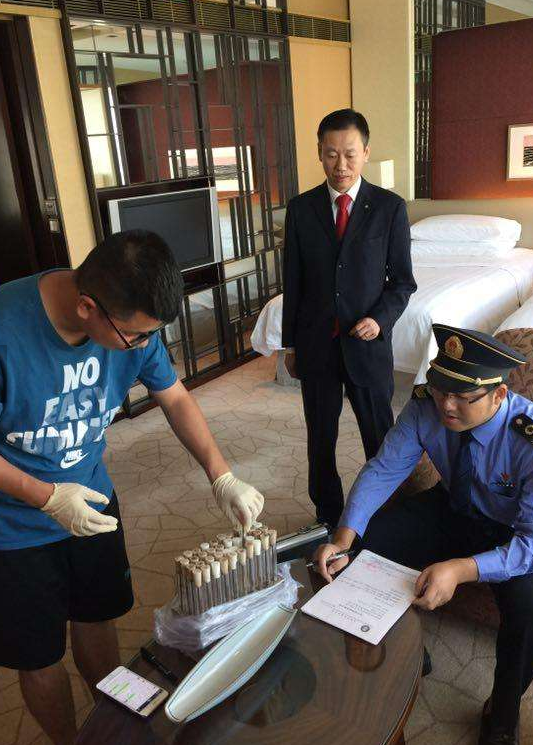 图注: 海淀区卫生和计划生育监督所联合海淀区疾病预防控制中心工作人员对北京香格里拉饭店的客房毛巾、浴巾、被罩、口杯、浴盆、脸盆等按照相应的检测项目进行了采样,共计采样20件,统一送海淀疾控中心实验室进行检测,全面掌握客房公共设施的清洁消毒状况。