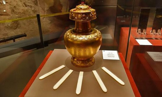乾隆皇帝御制的用以掣定蒙藏大活佛转世灵童的金瓶和象形签。