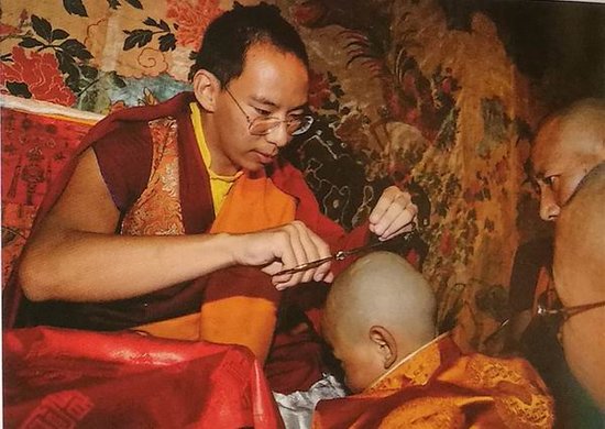 图为2010年7月,班禅额尔德尼·确吉杰布为六世德珠活佛剃度并赐法名,图片来源:《班禅额尔德尼·确吉杰布坐床二十周年》画册。
