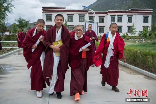 2017年7月10日,西藏佛学院首届少年活佛班7名学员完成三年小学阶段任务,顺利毕业。图为小活佛们在校园里相伴而行。中新社记者何蓬磊摄