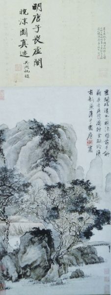 诗堂左侧大字题:“明唐子畏虚阁晚凉图真迹。吴湖帆题。”下钤:吴湖帆、梅景书屋。右侧陈定山小字题:“唐子畏纸本传世绝尠,近独见此又为极晚笔。子畏设色多雅澹,此独浑厚,盖三绝也。定山。”下钤朱文?。憾ㄉ健J糜蚁陆怯行彀畲镌缒暾庞。盒脑恫萏谩J糜弥剿莆偶哪谝常ǚ疵妫?。