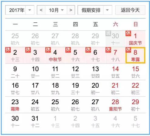 央视网消息:根据2017年中秋节、国庆节放假安排,10月1日(星期日)至10月8日(星期日)放假调休,共8天。9月30日(星期六)上班。根据铁路提前30天购票的规定,国庆长假期间的所有火车票现在都可以预订了。