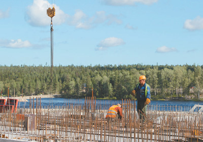 8月15日,在俄罗斯西北部卡累利阿共和国凯姆河畔,工人在别洛巴罗什水电站施工现场工作。