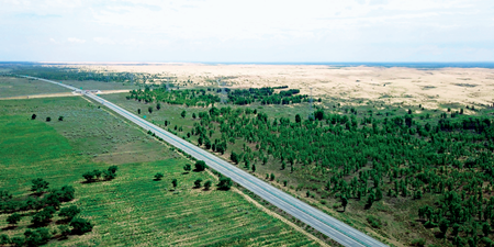 1997年,杭锦旗向沙漠发起阵地战,全旗10余万干部群众人人捐钱捐物,万人会战7次,吃在沙漠里,睡在风沙里。盐厂改制而成的亿利资源集团投入人力、资金参战。历时3年,终于打通了第一条纵贯库布其沙漠南北、全长115公里(沙漠段长65公里)的柏油路,创造了“大漠奇?!薄?/p>