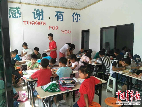 大学生志愿者在“爱心小院”给留守儿童辅导功课。