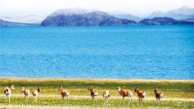 碧蓝的色林错湖畔,藏羚羊自由自在地活动、觅食。新华社记者曾涛摄