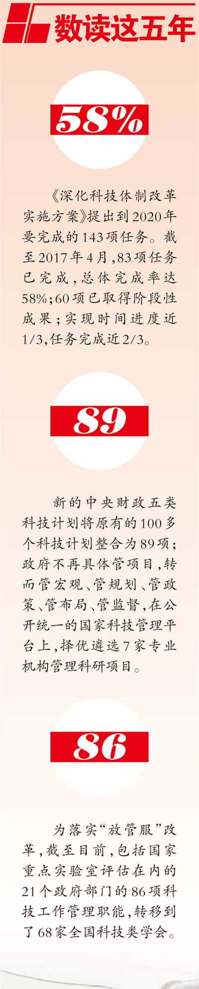 据科技部统计,截至2017年4月,《深化科技体制改革实施方案》提出到2020年要完成的100多项改革任务,83项任务已完成,总体完成率达58%,60项任务已取得阶段性成果。