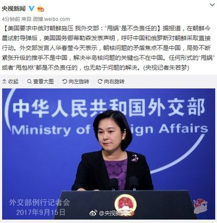 据报道,在朝鲜今晨试射导弹后,美国国务卿蒂勒森发表声明,呼吁中国和俄罗斯对朝鲜采取直接行动。外交部发言人华春莹今天表示,朝核问题的矛盾焦点不是中国,局势不断紧张升级的推手不是中国,解决半岛核问题的关键也不在中国。任何形式的“甩锅”或者“甩包袱”都是不负责任的,也无助于问题的解决。