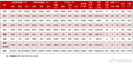 截至2017年9月15日,督察组交办的环境举报,地方已办结35039件,办结率达到88.5%。其中,责令整改32602家;立案处罚9181家,???6583.84万元;立案侦查297件,行政和刑事拘留364人;约谈4210人,问责5763人。