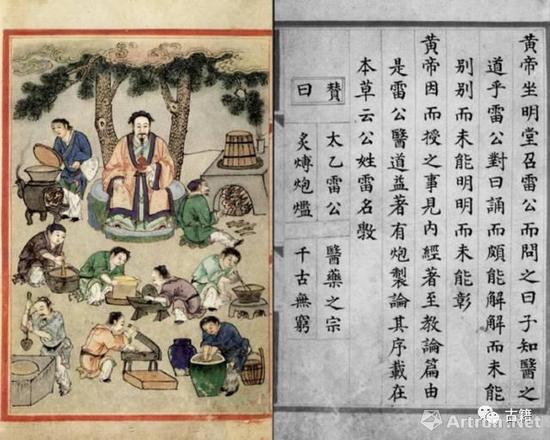 该书卷首有两幅极为精美的主题图。第一幅为“受教图”,绘制的是雷公下跪接受黄帝授书、传医道的场景,是根据《素问》中提到的雷公受教于黄帝的记载创作的。第二幅为“炮制图”,图中雷公端坐于上,周围有9名药工在切药、碾药、杵药、研药、煮药、蒸药、炒药、筛药、淘药,展示了古代炮制的主要手段和工具。