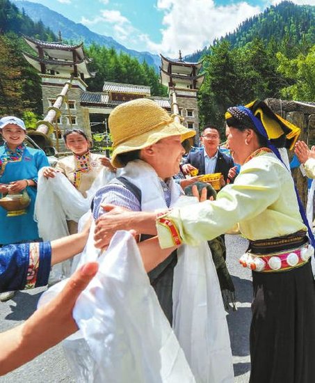 黑水县沙石多乡的藏族妇女热情迎接前来指导的杨华珍。尹钢摄