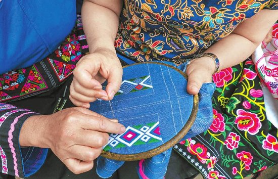 杨华珍向一位羌族绣娘传授刺绣技艺。尹钢摄