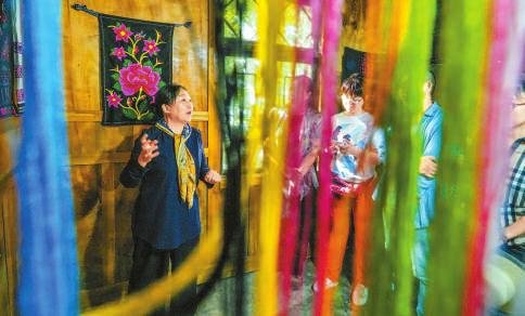 杨华珍(左一)带领学生深入村寨,了解藏羌织绣的工艺特点。尹钢摄