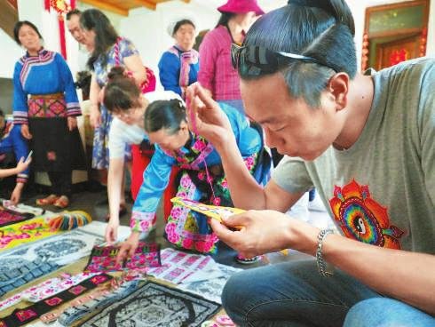 杨华珍又一次来到汶川县绵虒镇羌锋村,指导寨子里的羌族妇女制作传统绣品。尹钢摄