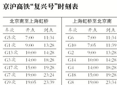 据北京南站新闻发言人梁兆玉介绍,9月21日起,北京南至上海虹桥开行7对“复兴号”中国标准动车组,按照每小时350公里运行,车次分别为:北京南至上海虹桥的G1、G3、G5、G7、G9、G13、G17次列车;上海虹桥至北京南的G2、G4、G6、G8、G10、G14、G18次列车。京沪之间全程运行压缩时间近30分钟,控制在4个半小时左右。