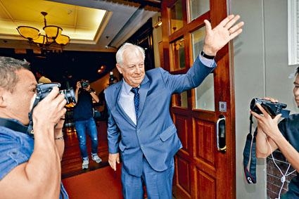 【环球时报驻香港特约记者 杨伟民】在反对派麻烦不断、人人喊打的低潮时刻,“末代港督”彭定康借宣传新书之机入港,再对香港事务指手画脚。他在午餐会上继续“指指点点”,并当着一堆“旧电池”的面,点名称赞正在监狱服刑的非法“占中”头目黄之锋是难得的“优秀年轻人”,被认为是“钦点”接班人。