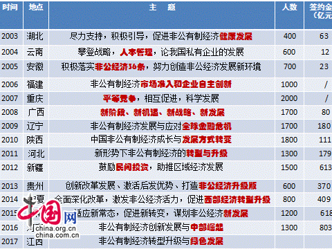 细数过往历程,非公经济论坛在民建中央的积极推动下,不断创新,不断突破,取得了很多可圈可点的成就:举办过的城市横跨东西、纵横南北,覆盖15个省市自治区;十五届论坛参会总人数达到18400余人次,共收到论文3200余篇,内容涉及各地非公经济发展现状、公有制和非公有制经济的关系、非公有制经济的市场准入、非公有制经济投融资、非公有制经济法律法规完善等诸多方面,基本涵盖了非公有制经济的各个方面以及热点问题;共达成项目签约金额总计4743.95亿元,这些项目的签约,为举办地的非公有制经济发展注入了新的生机和活力,也为中国非公有制经济发展论坛带来了良好声誉。