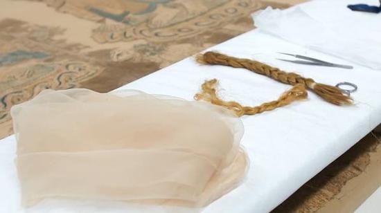 修复师使用一种尼龙网作为覆盖层,它非常柔软,不会造成摩擦损伤,同时它又非常的牢固,它能够提供文物在竖直展出时所需要的强度。修复师将这层网铺在刺绣上后,从作品的中间部分开始,然后逐渐把网从中间慢慢铺展开来,一直到两边。