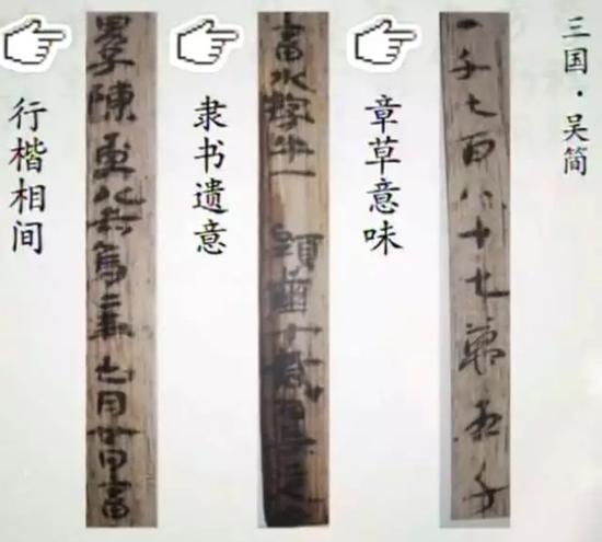 在魏晋的简牍中,楷书的影子已经有了。魏晋简牍大批量的被发现是在湖南长沙的五一广场。当年楚汉故城就在今长沙五一广场一带,1996年夏天,广场要建立商贸大厦,基地动工时发现了这批珍贵的简牍,五十多口古井里,出土了近10万枚三国吴简。