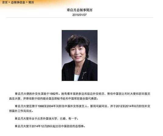 2014年12月29日,刘结一在纽约履职一年半后,中国新任驻纽约总领事章启月抵达纽约履新,成为历史上首位中国驻纽约女总领事。