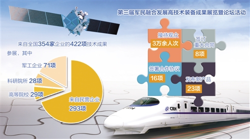 为期7天的第三届军民融合发展高技术装备成果展览上,一批自主可控的核心信息技术等军民融合发展成果纷纷亮相。本届展会共展出422项技术成果,签订8项重大合同,签署16项合作协议,发布23项新产品,显示出近年来我国信息技术领域军民融合发展取得重大突破