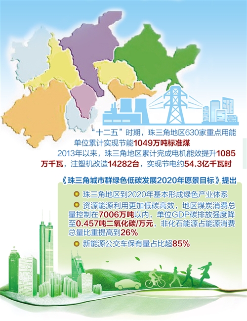 《珠三角城市群绿色低碳发展2020年愿景目标》提出,珠三角地区到2020年基本形成绿色产业体系,积极培育节能环保等绿色产业;资源能源利用更加低碳高效,地区煤炭消费总量控制在7006万吨以内,单位GDP碳排放强度降至0.457吨二氧化碳/万元,非化石能源占能源消费总量比重提高到26%;新能源公交车保有量占比超85%;珠三角9市全部成功创建国家森林城市;全面实施城市空气质量达标管理,PM2.5年均浓度不高于34微克/立方米;珠三角9市率先推广碳普惠制,引导形成全社会绿色消费和低碳生活的良好氛围,努力走出一条具有珠三角特色的绿色低碳发展新路。